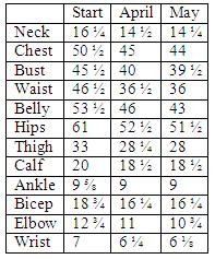 So, I’ve changed things up a little bit. A long time ago I took measurement every week. I was losing weight fast enough that there was a difference from week to week. As I started to slow my rate of loss, I didn’t see that week to week change and just plain got really tired of taking measurements. Then I started slacking off and not really losing weight at all so I flaked on it altogether. I’ve now started taking monthly measurements because it affords me the satisfaction of seeing changes but it also doesn’t annoy me to do it so often. I win.